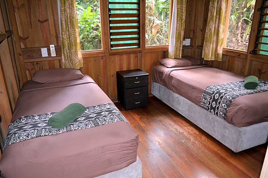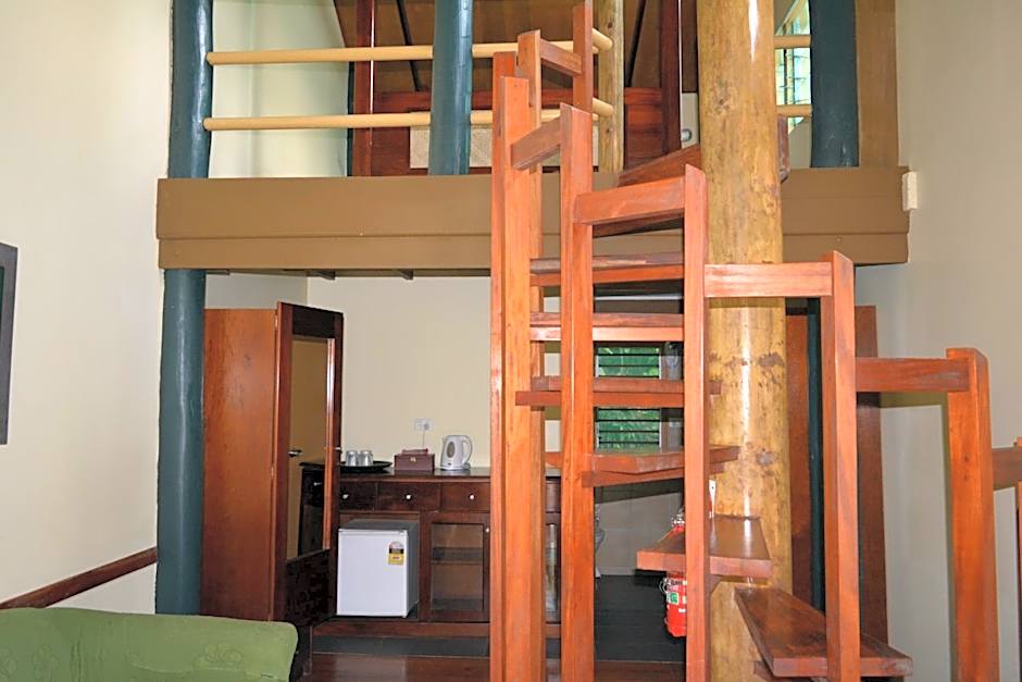 This family room has a master bedroom with 1 queen-sized bed an adjoining mezzanine floor with 4 single-sized beds. The lounge, kitchenette and dining area connected to a covered, elevated deck, bordered by natural rainforest. Room service is available. There is also a ceiling fan, electric kettle, refrigerator, 4-burner gas stove top, microwave, toaster, dining table, washing machine, local TV channels and free WiFi.