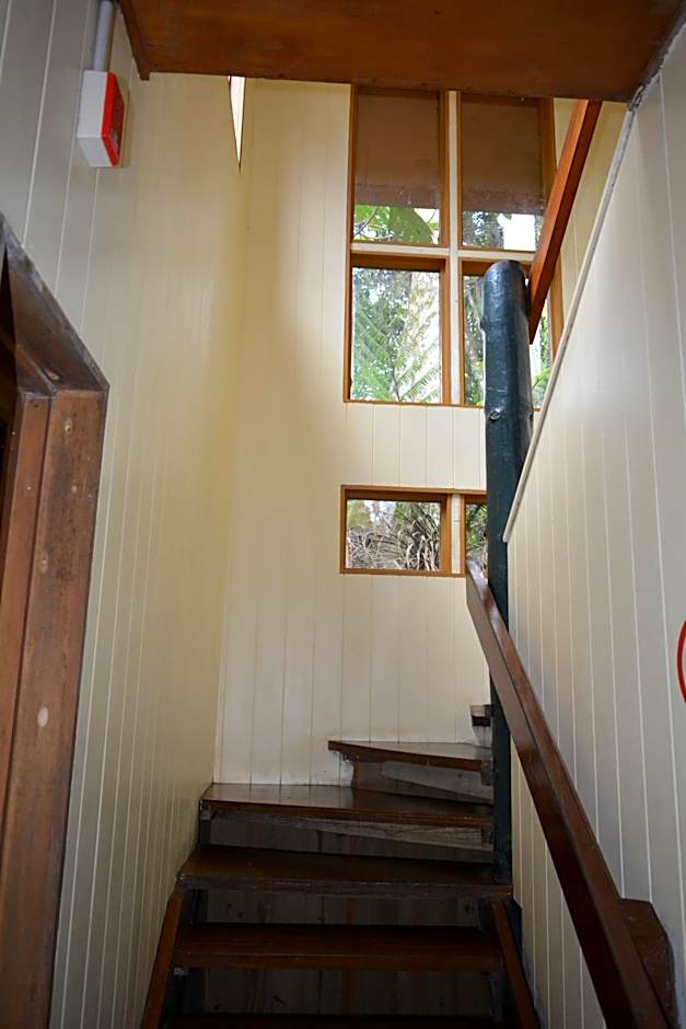 This studio is split-level, with a queen-sized bed on the mezzanine floor. Your living area cnonects to a deck with a table and chairs. A spiral staircase, ceiling fan, electric kettle, bar fridge and local TV channels are all provided.