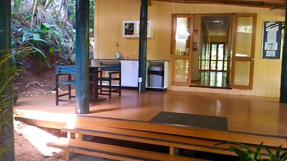 This studio is split-level, with a queen-sized bed on the mezzanine floor. Your living area cnonects to a deck with a table and chairs. A spiral staircase, ceiling fan, electric kettle, bar fridge and local TV channels are all provided.